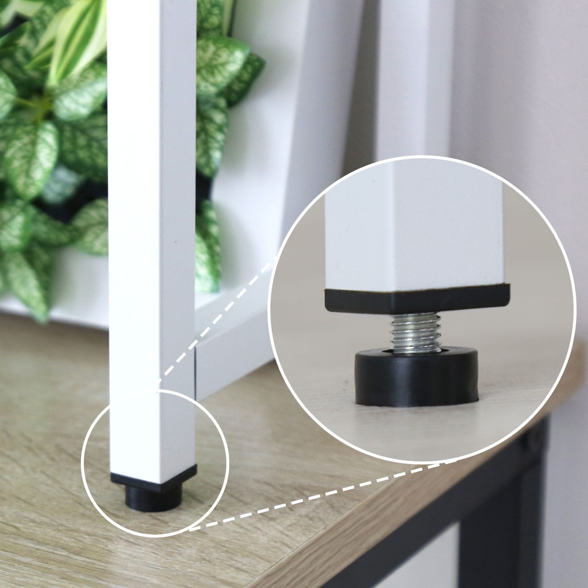 脚部にはアジャスターを搭載し、設置場所のわずかな段差や傾きを調整可能。がたつきを防ぎ、安定した使用感を保ちます。デスク上はもちろん、パウダールームやキッチンの収納ラックとしても活躍し、限られた空間を無駄なく使えます。