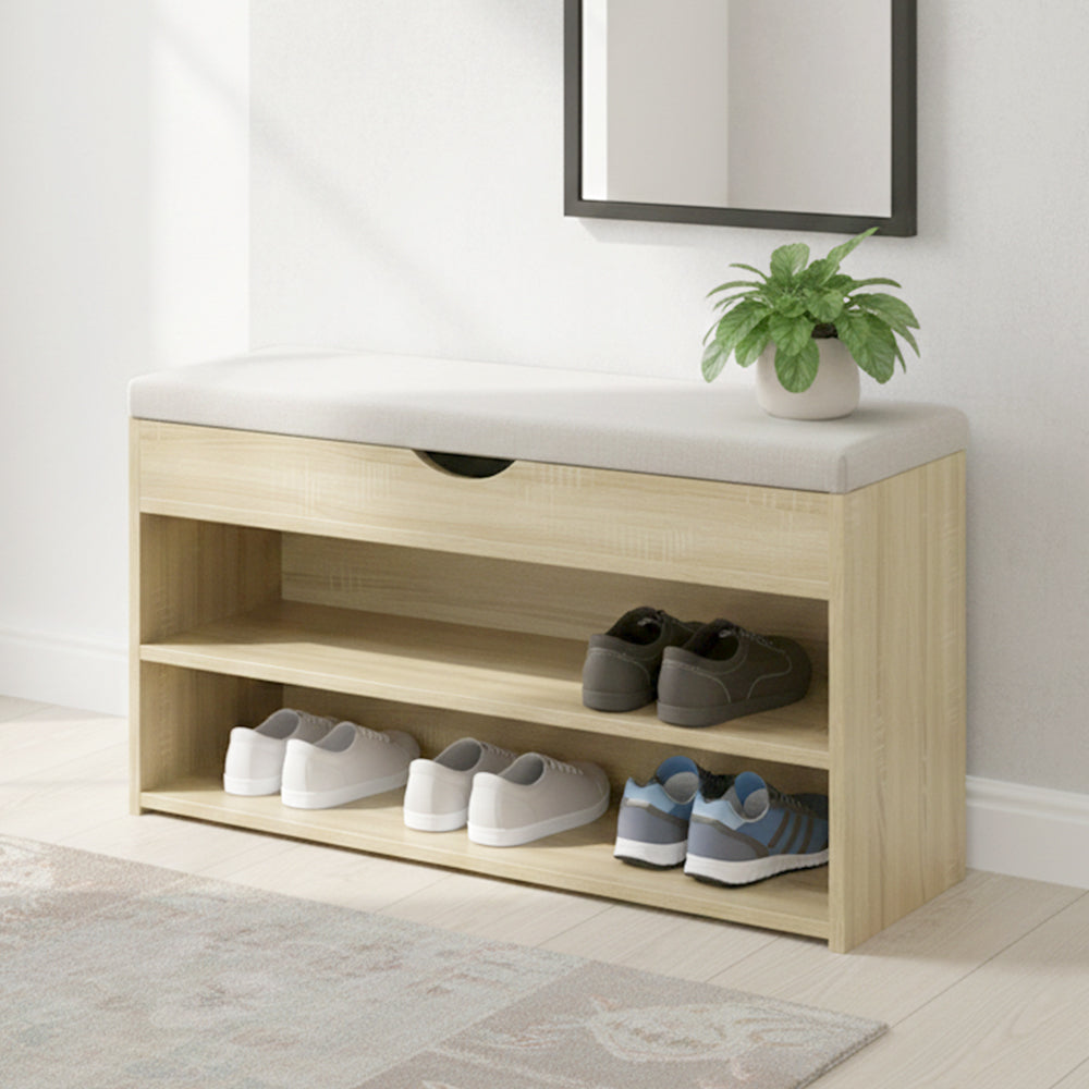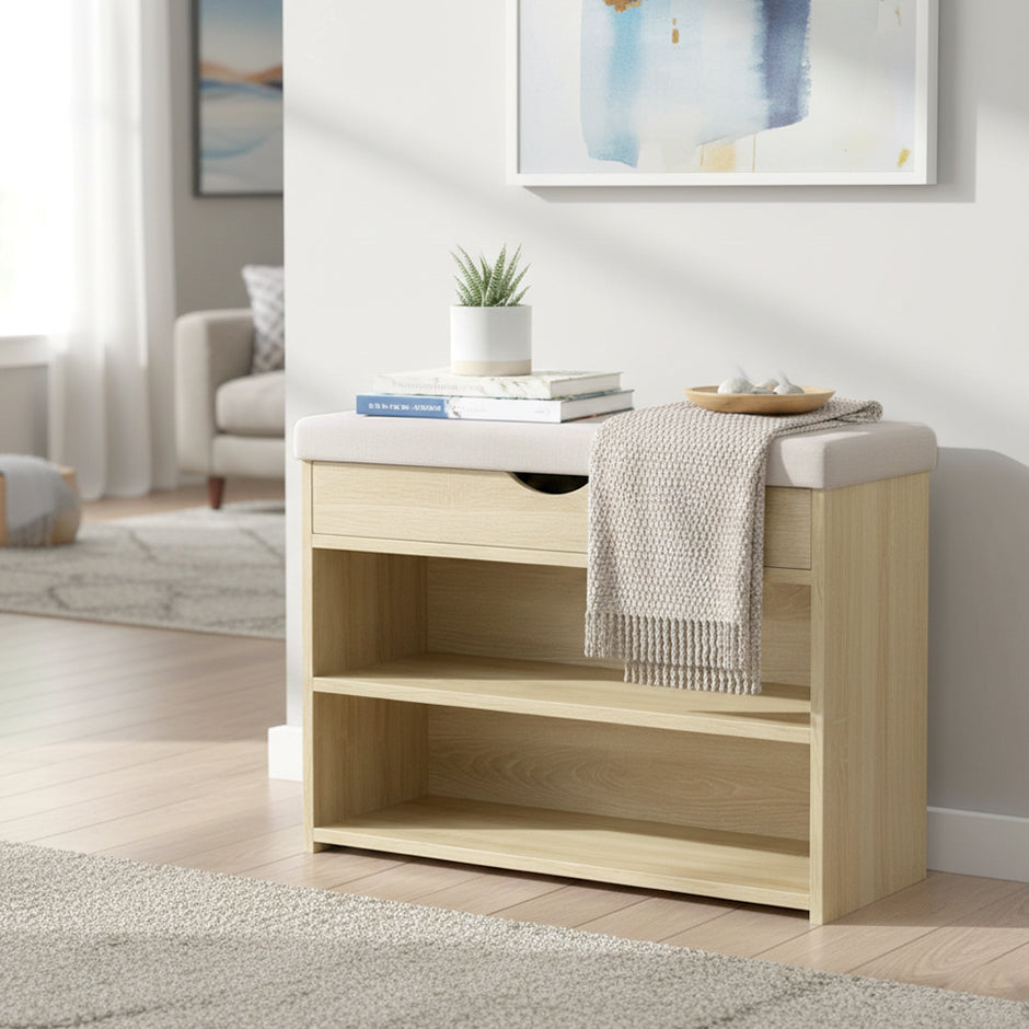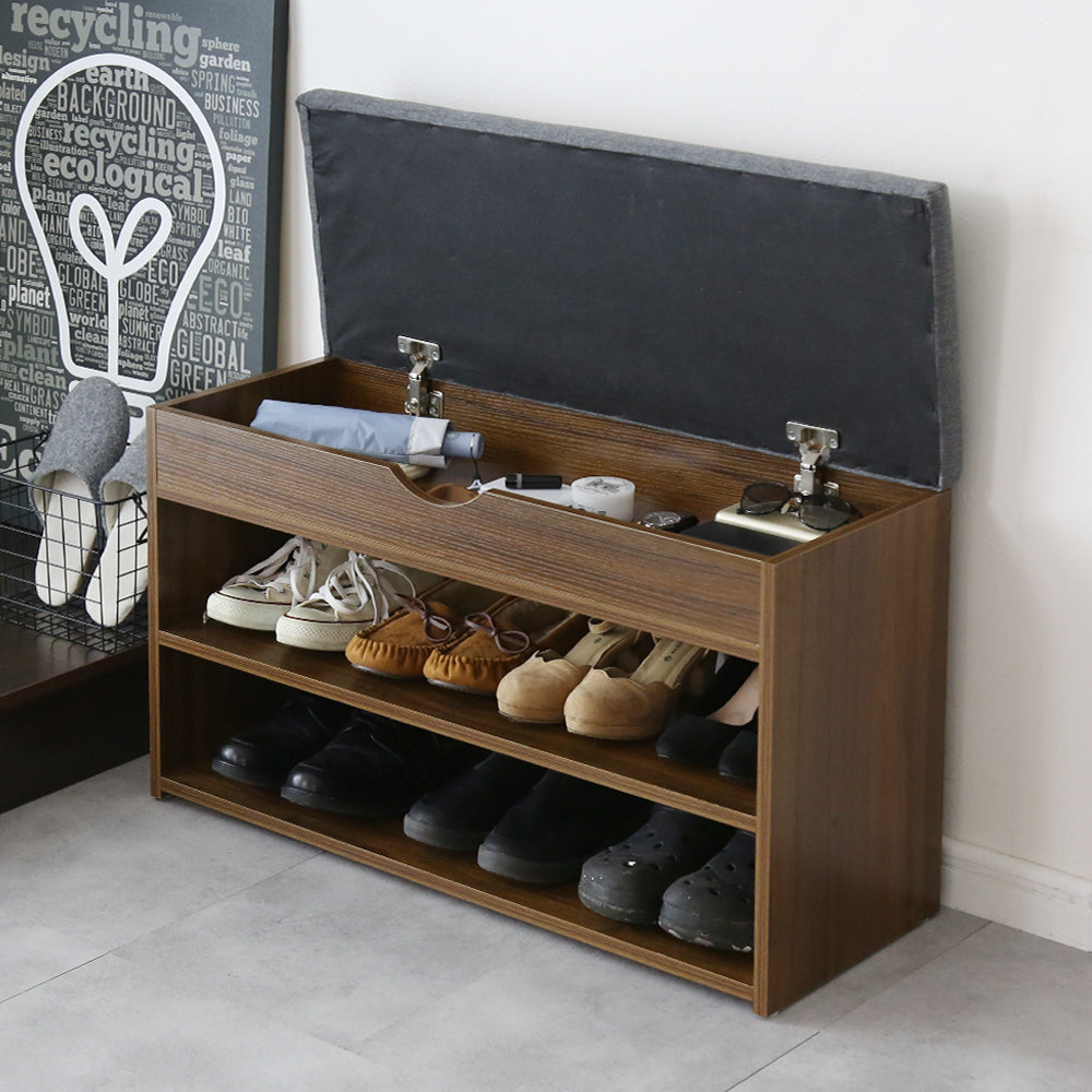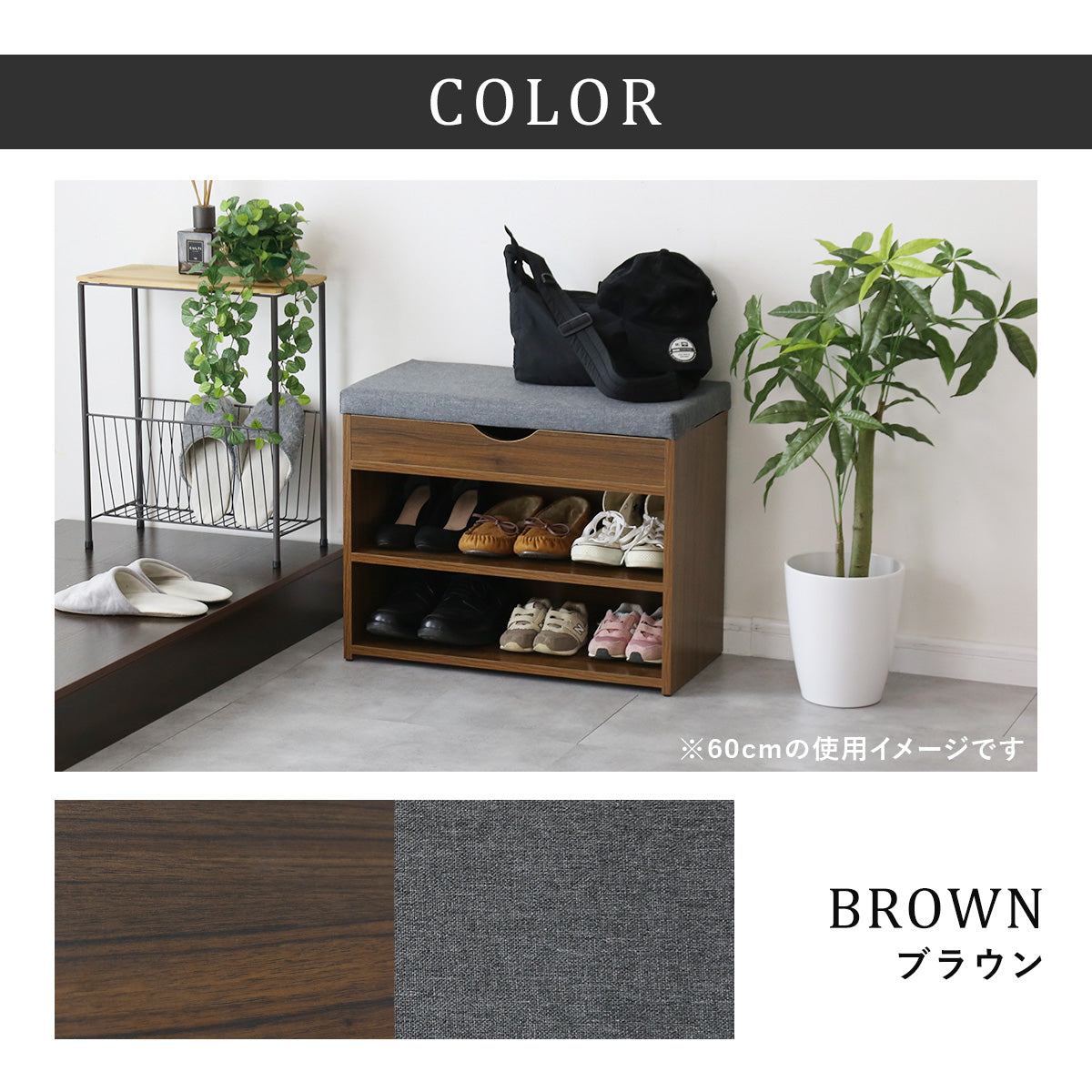 座面にはウレタンフォーム入りクッションを使用。硬すぎず柔らかすぎないバランスで、安定して腰掛けられます。毎日の靴の脱ぎ履きがラクになるのはもちろん、買い物帰りにちょっと荷物を整理したり、子どもの靴を履くサポートをしたり、“座れる玄関” は想像以上に快適です。