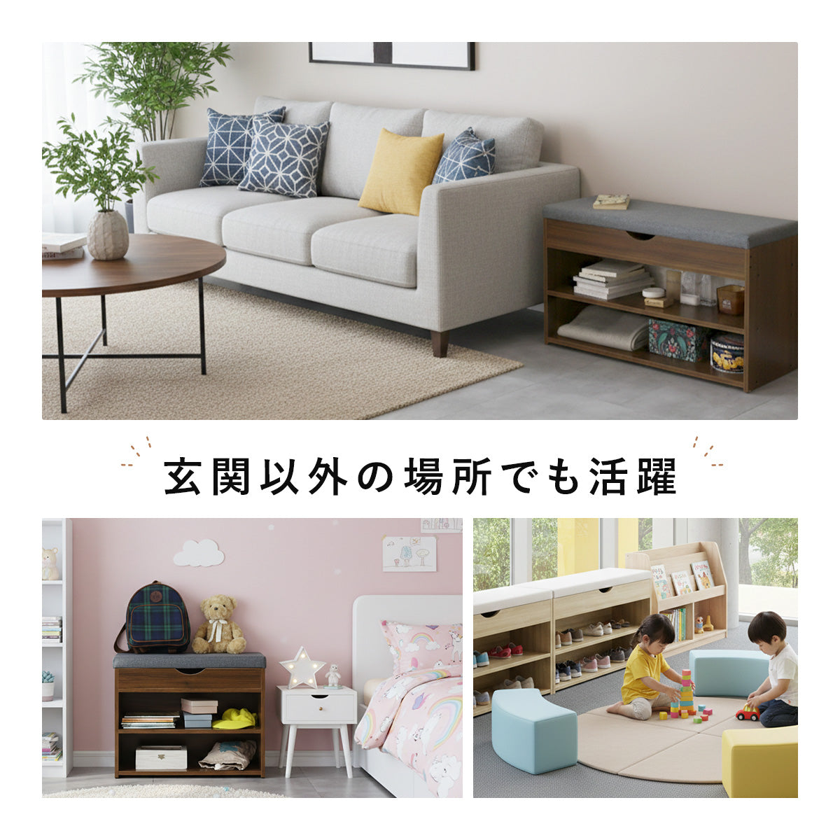 シンプルでナチュラルなデザインは、玄関以外の空間にも馴染みやすいのが魅力。リビングでは小物収納ベンチとして、子ども部屋では絵本やおもちゃ収納として、キッズスペース等に設置する子供たち用の靴置きとしても使えます。ひとつ置くだけで空間が整い、暮らしやすさがぐっと向上します。